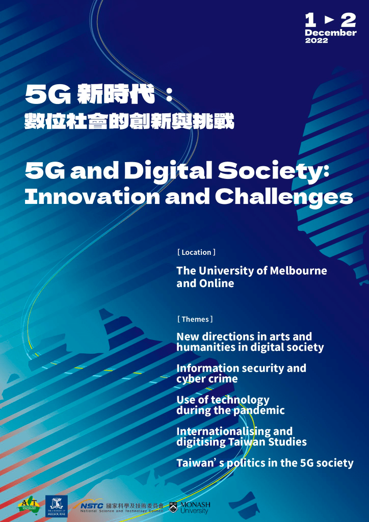 The Australiasian Taiwan Studies Association (ATSA) is pleased to organise an international conference, 5G and Digital Society: Innovation and Challenges, to be held on 1-2 December 2022. This conference is funded by the Taiwan’s National Science and Technology Council. The major themes include how new technologies bring new challenges and potential to the seemingly more traditional fields of arts and humanities, how they change interpersonal relationships and the ways people acquire and access information, and how they contribute to or damage our society during the Covid pandemic, with a focus on Taiwan and/or Australia. We also welcome comparative studies between Taiwan and other parts of Asia.
